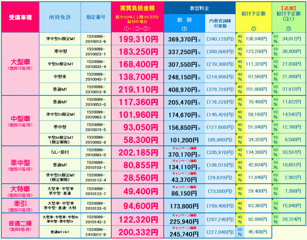 ◆補習教習、再検定等が発生した場合、別途追加費用(当校料金表参照)が必要となります。
