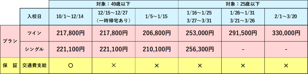 ※グル割(5,000円値引き)‥ご友人等と2名以上で同日入校をされた場合に適用(自炊プランは対象外)