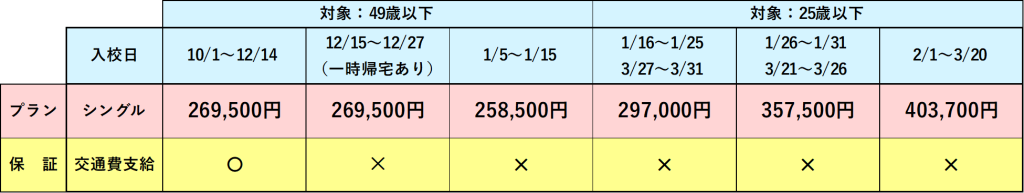 ※グル割(5,000円値引き)‥ご友人等と2名以上で同日入校をされた場合に適用(自炊プランは対象外)