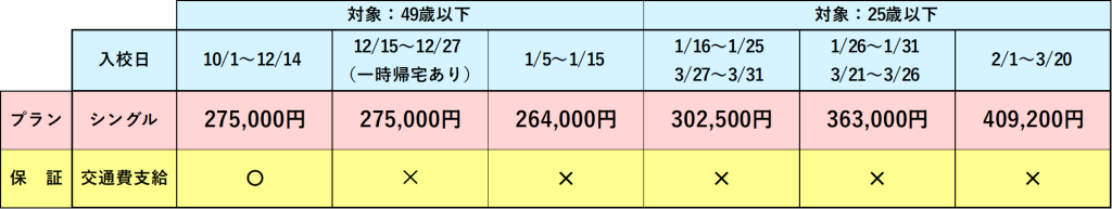※グル割(5,000円値引き)‥ご友人等と2名以上で同日入校をされた場合に適用(自炊プランは対象外)