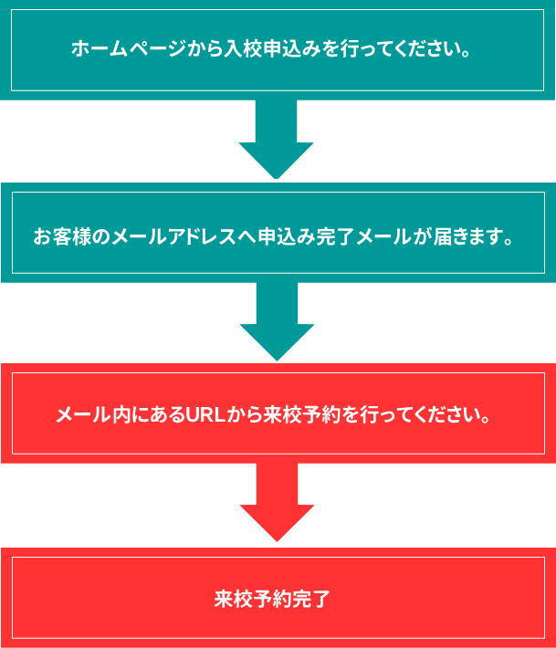 - 送信後に届く 申込み完了メール内のURL から、カレンダー形式の予約システムへ進み、来校希望日時を選択して予約を完了してください。